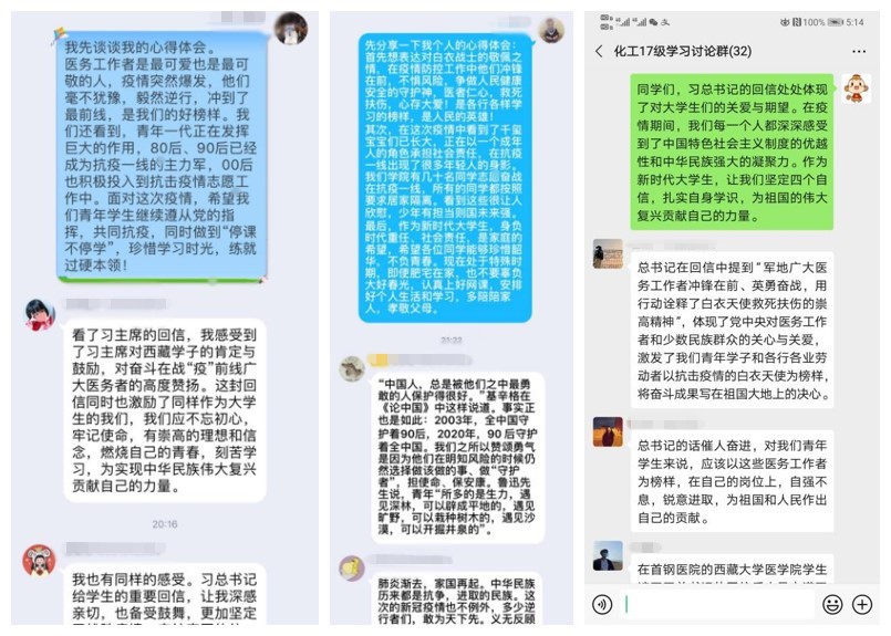 党支部集体学。各学生党支部积极发挥基层组织作用,组织全体党员集体学习,党员撰写学习心得,并通过学习强国学习群、QQ群等进行线上讨论,交流感悟,相互促进,共同学习。