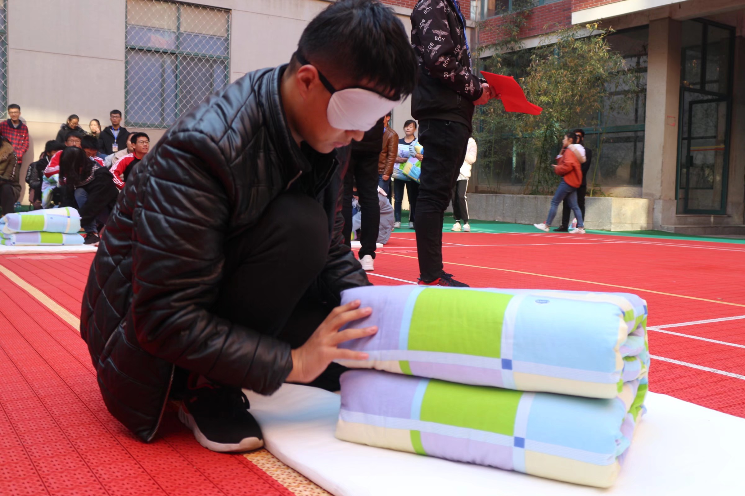 首先由徐华坤老师发表讲话,他表示此次军被大赛将军训学习的技能融入到现实生活中,为营造良好的宿舍环境创造了机会。比赛分为四轮,分别为班级个人叠被、个人蒙眼叠被、男女两人单手合作叠被、个人完成指定动作进行叠被。参赛人员以极为认真的态度快速完成了比赛任务,一个个细致入微的动作,一张张认真严肃的面容,体现了大一新生在军训中所锻炼出来的踏实肯干的作风。现场气氛紧张热烈,观众们的掌声、助威声连成一片。大赛中的游戏环节增强了台上与台下同学的互动性,学长学姐的助力表演更是将比赛推向了高潮。