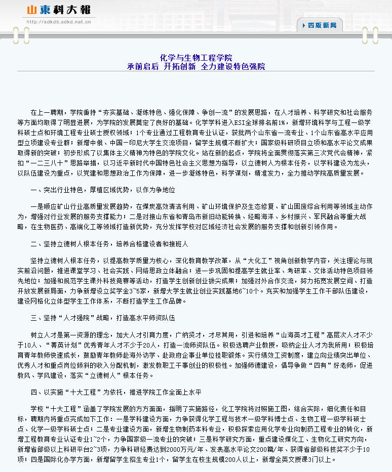 在上一聘期,学院秉持“夯实基础、凝练特色、强化保障、争创一流”的发展思路,在人才培养、科学研究和社会服务等方面均取得了明显进展,为学院的发展奠定了良好的基础。化学学科进入ESI全球排名前1%,新增环境科学与工程一级学科硕士点和环境工程专业硕士授权领域;1个专业通过工程教育专业认证,获批两个山东省一流专业、1个山东省高水平应用型立项建设专业群;新增中俄、中国—印尼大学生交流项目,留学生规模不断扩大;国家级科研项目立项和高水平论文成果取得新的突破;初步形成了以集体主义精神为特色的学院文化。站在新的起点,学院将全面贯彻落实第三次党代会精神,紧扣“一二三八十”思路举措,以习近平新时代中国特色社会主义思想为指导,以立德树人为根本任务,以学科建设为龙头,以队伍建设为重点,以党建和思想政治工作为保障,进一步凝练特色,科学谋划,精准发力,全力推动学院高质量发展。