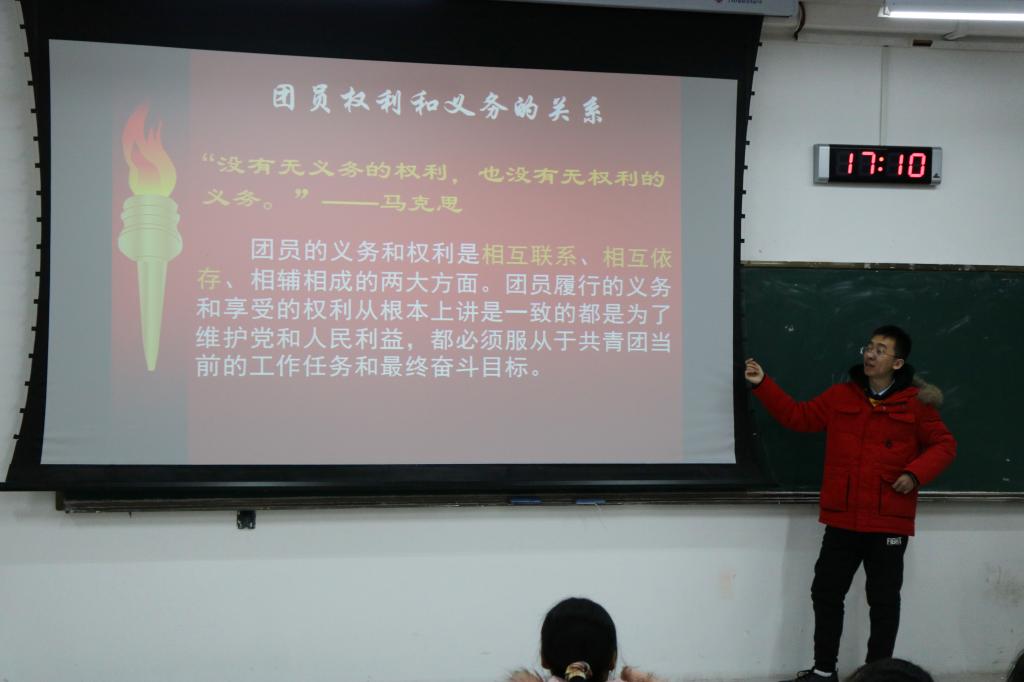 满灏老师围绕团章就团员的权利与义务向同学们做出了讲解,带领同学们重学了团章。他强调,共青团是党的后备力量,作为一名新时代的团员,要高举中国特色社会主义伟大旗帜,始终跟随党的前进方向,吃苦在前,享乐在后,为民族复兴和国家富强做出应有的贡献。随后,满灏老师对团员的日常管理作出讲解,并介绍了基础团务有关内容。他要求同学们认真履行团员义务,积极参加团组织的各项活动,为学校、学院和班级争光添彩。