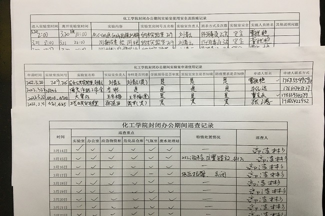 书记、院长和实验室主任一直坚守在教学区办公。根据学校规定及师生需求,制定了实验室临时使用审批制度、实验室安全使用及防疫登记制度、办公区域、实验室及重点危险源日检制度等;保证线上教学有序进行,做到学生紧迫学业或科研任务不耽误,教职工需求能够及时得到满足;确保实验室安全运行和防疫措施落实到位;抓牢安全运行,不断完善实验室管理,落实落细常态化疫情防控举措,构筑校园安全严密防线,全力保障师生安全。