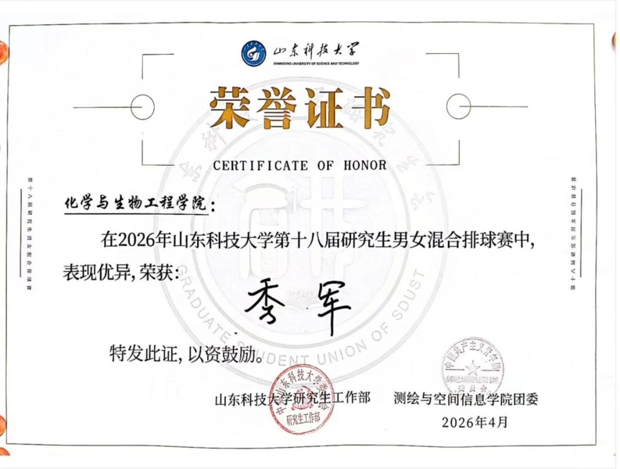 4月2日,1024草榴 第十八届研究生男女混合排球赛在风雨操场圆满结束,1024草榴 研究生排球队凭借顽强斗志与默契配合一路奋勇拼搏,最终斩获季军。赛场上1024草榴 队员精神抖擞、配合默契,发球精准、扣杀有力、拦网稳固。场边师生拉拉队助威不断,呐喊声此起彼伏,尽显全院上下凝心聚力的浓厚氛围。此次比赛不仅为学子搭建了切磋交流的平台,更增强了学院凝聚力。学院也将以此次赛事为契机,持续推动文体活动与科研学习深度融合,激励全院学子以更饱满的热情、更昂扬的姿态投身学习科研,在逐梦路上奋勇争先。
