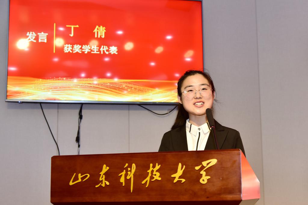 获奖教师代表王冬梅发言,她表示今后将继续紧盯课程核心任务,在培养学生高阶性、创新性和挑战度上下功夫。获奖学生代表丁倩表示,将勇担责任和使命,以己之力发光发热,回报学校、回报社会。