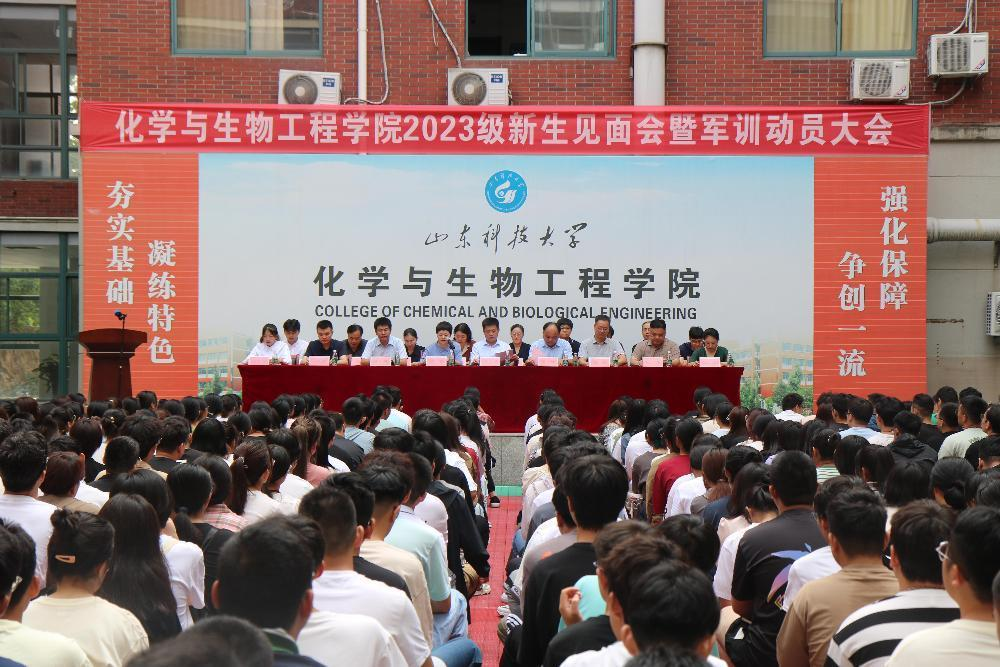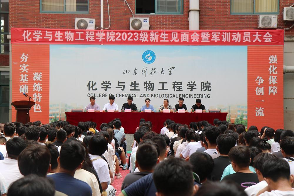 召开2023级新生见面会暨军训动员大会,金能化学(青岛)公司总经理伊国勇,学院党委书记窦存增,党委副书记兼副院长田静,副院长高军、李琳、王博、主曦曦,各系(中心)主任,支部书记,新生班主任,团委全体辅导员出席本次大会。大会由田静主持。