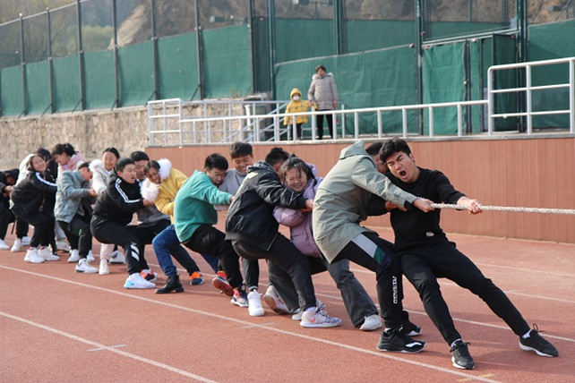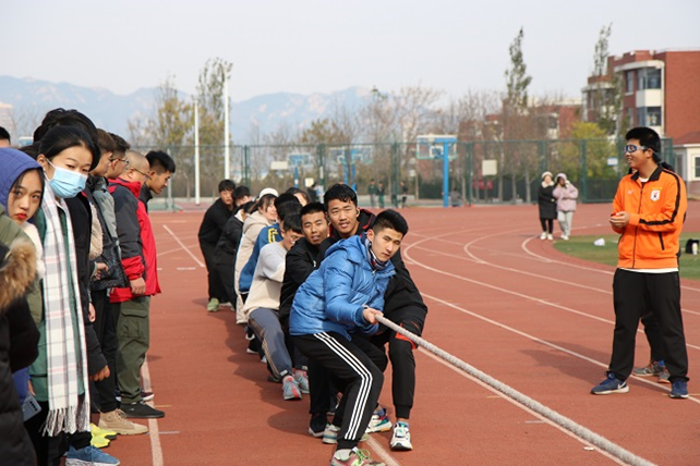 本次比赛的一大亮点是在赛制中设置了败者组。第一轮预赛中失利的队伍进入败者组,败者组队伍参加复活赛,进行组内PK,获胜一方即为复活成功,晋级下一轮。这既提供了更多的班级切磋的机会,又为比赛的最终成绩增加了含金量。2020级11个班各派出十名男生和八名女生组队参加比赛。赛前,各队积极讨论拔河技巧,排兵布阵,并进行热身运动,充分做好应战准备。裁判员一声令下,他们马上进入状态,双方队员角力对抗,奋力后拉,脚用力蹬地,身体后坠,不让绳子前进分毫。大家心往一处想,劲往一处使,“一二、一二……”的口号声响彻在高地操场的上空,气势如虹。现场啦啦队员也是热情高涨,呐喊助威,给比赛增添了一抹亮色。