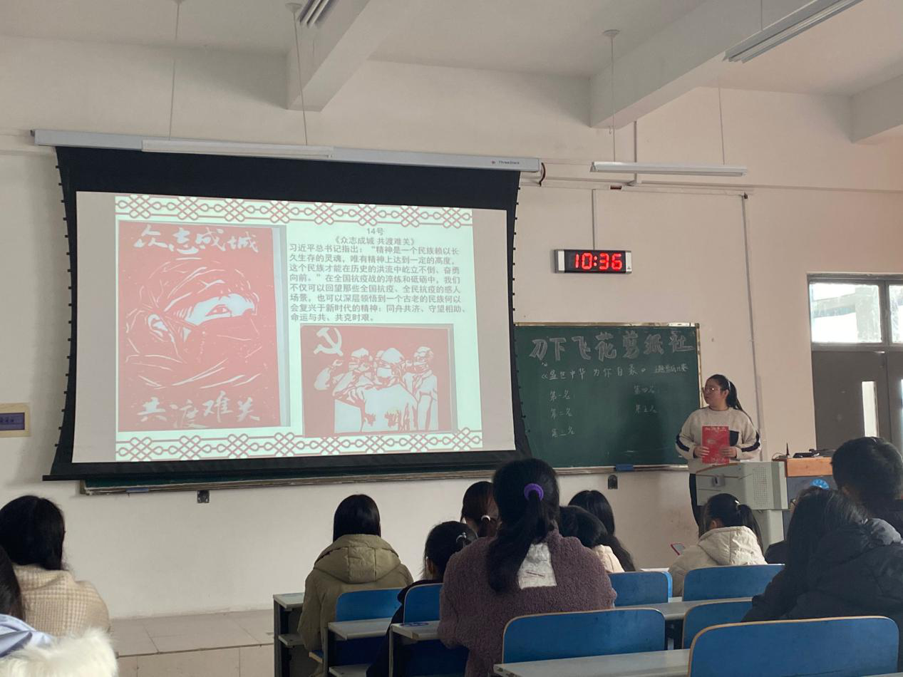 活动伊始,社团负责人胡洁介绍源远流长的剪纸文化,呼吁同学们关注剪纸这一优秀的非物质文化遗产。接着主持人一一展示参赛作品,并邀请14名参赛者上台讲述剪纸作品内涵。6号参赛者李晓艺说道:“我的作品主题是《最美逆行者》,在疫情中医护人员就是最美的人,他们有一些还是80、90后,虽然年轻,却已经为祖国的安全保驾护航,值得我们尊重敬佩。”