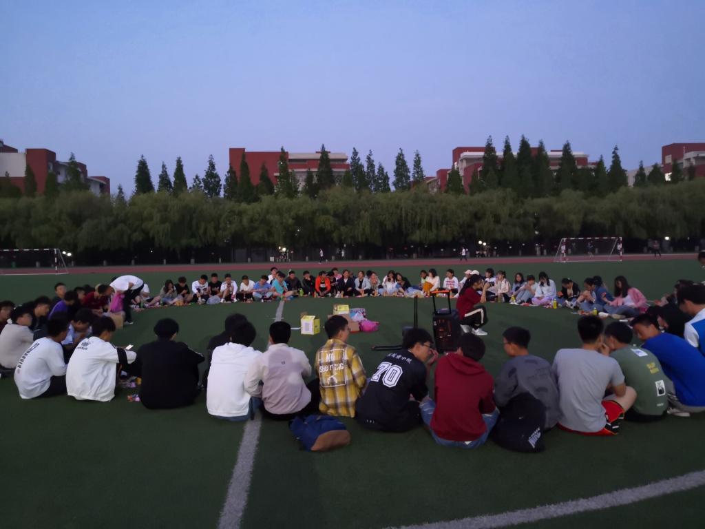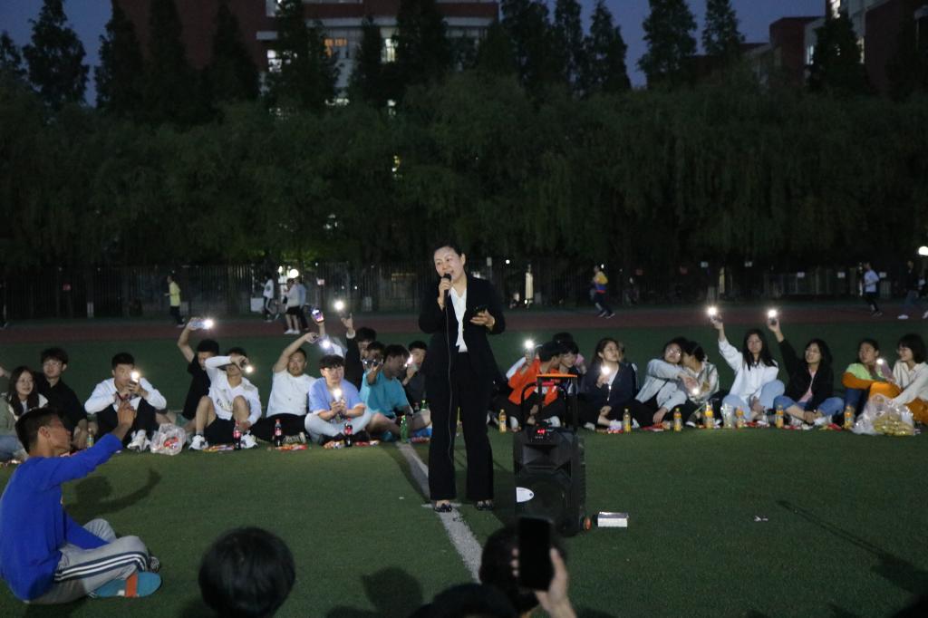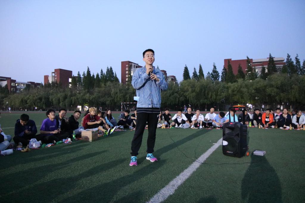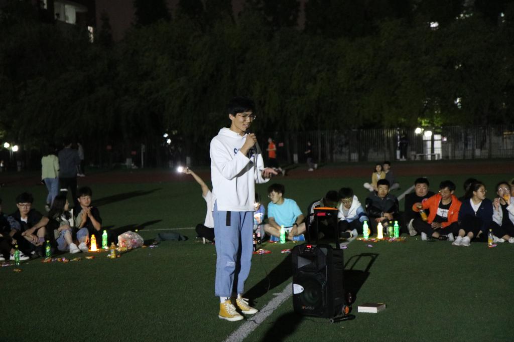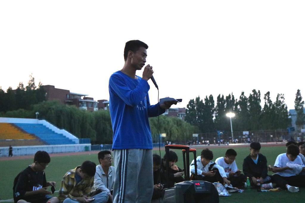 夜幕初起,老师和同学们在谈笑之间围成了一个圈,把圆圈中间作为舞台。19:00,主题团日活动开始,主持人李彦钊首先发表了一段关于本次校运会再获双冠暨甲组十连冠乙组十年九冠的总结,他的讲述激情澎湃,引发同学们回忆起一周前的运动会,激发了大家的真情共鸣。随后,他请出了为运动会提供主力后勤保障服务的1024草榴