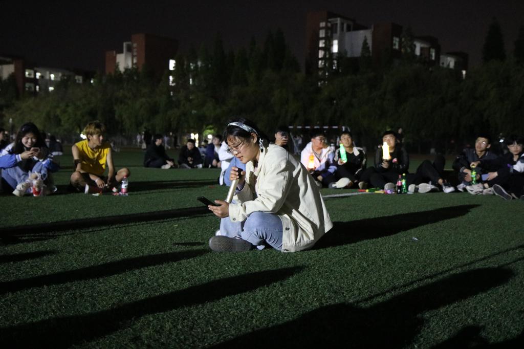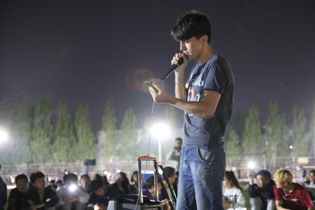 在之后的表演环节中,到场的老师给大家带来了重重惊喜:2020级辅导员满灏老师献唱《没有共产党就没有新中国》和《奔跑》,伴随着同学们的自发合唱和热烈掌声,让同学们不由得惊呼“今天看到了不一样的满老师,但都是一样的贴心满满”;2019级辅导员李玲玲老师为大家带来《打靶归来》和《最浪漫的事》,第一首的激昂动听歌声让同学们想起了战士打靶的场景,第二首更是唱出了全体辅导员的心声:“我能想到最浪漫的事,就是和你们一起慢慢变老……”;随后,易凡老师一首气势磅礴的《精忠报国》,让在场同学禁不住回想起近代百年的中国史,跟着她一起唱出了青年学生精忠报国的热情,并一起喊出了“化工化工谁与争锋”的运动会口号,掀起一个小高潮;最后,2018级辅导员徐华坤老师演唱《踏山河》,全体同学倾情跟唱并打开手机手电筒左右摇摆------一百多部手机的熠熠光芒与天上的闪烁星光遥相呼应,歌声、星光和掌声不仅让到场师生倍觉幸福美好,而且惊艳了风雨操场的所有行人。一位来自塔吉克斯坦的大二留学生被歌声感动驻足不愿离去,主动提出为大家唱首歌,主持人以中国人特有的热情友善把他请到圈中,他满含柔情地为大家演唱了一首英语歌曲《PERFECT》,给这场红歌会带来了异国情调和别样惊喜。