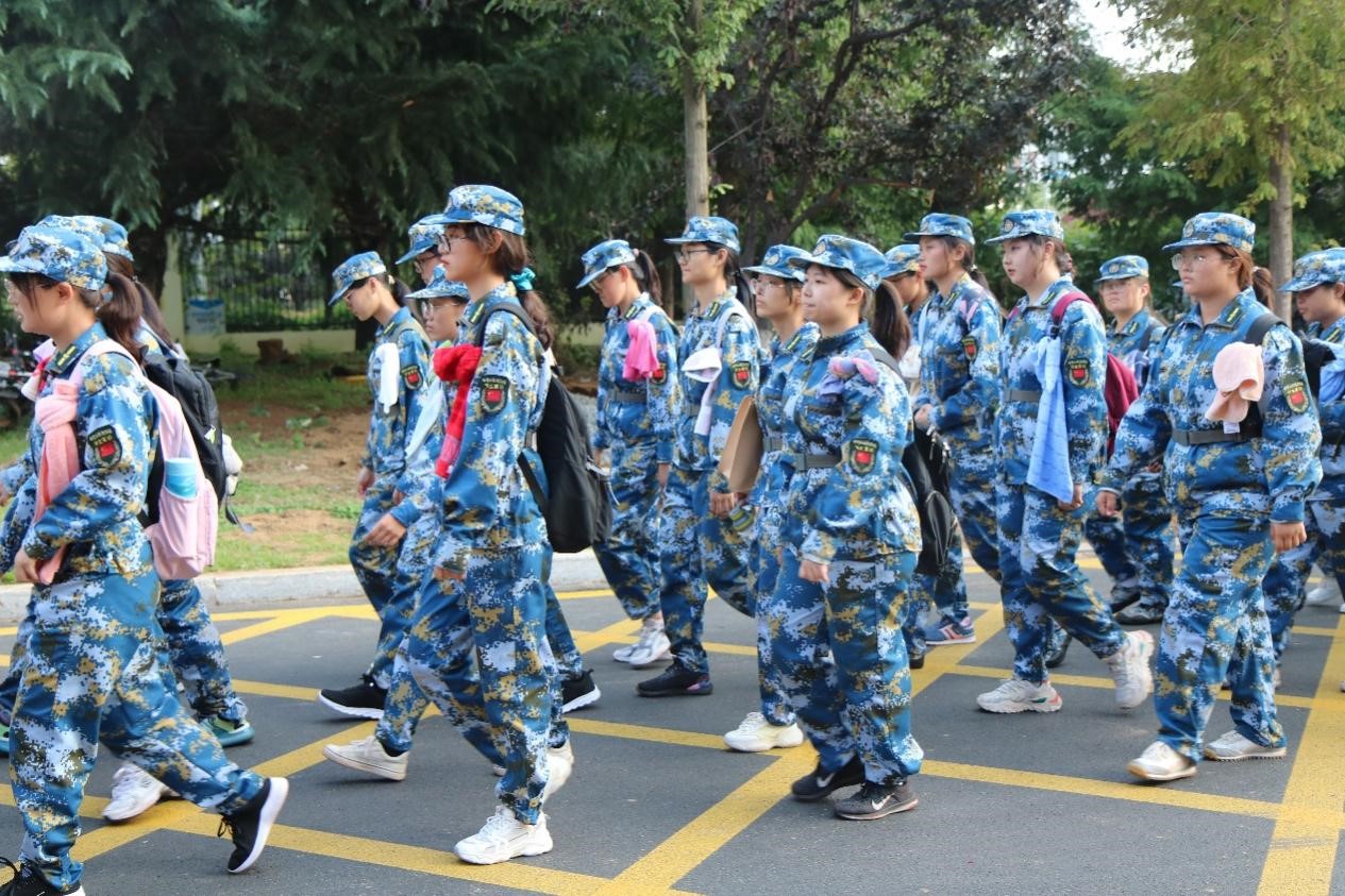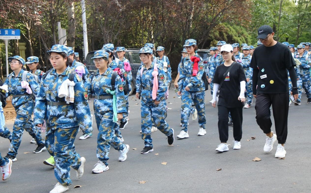 2021级大一新生在军训教官的带领下开展军训行军拉练,学院党委副书记兼副院长田静、新生辅导员易凡、王大鹏、李淑全程陪同。