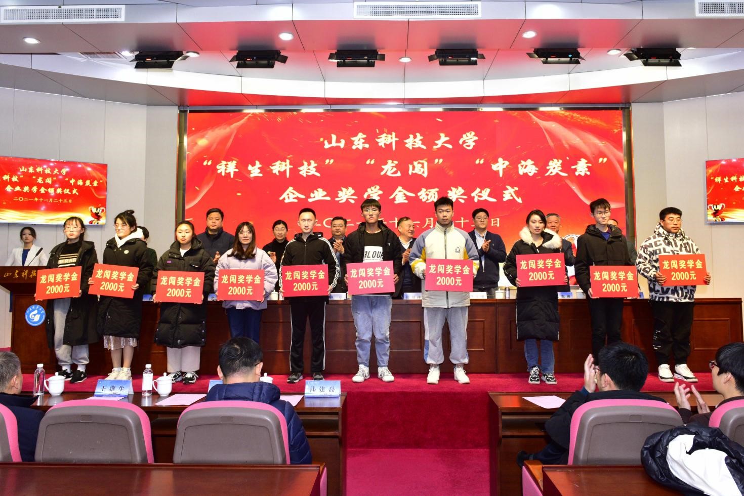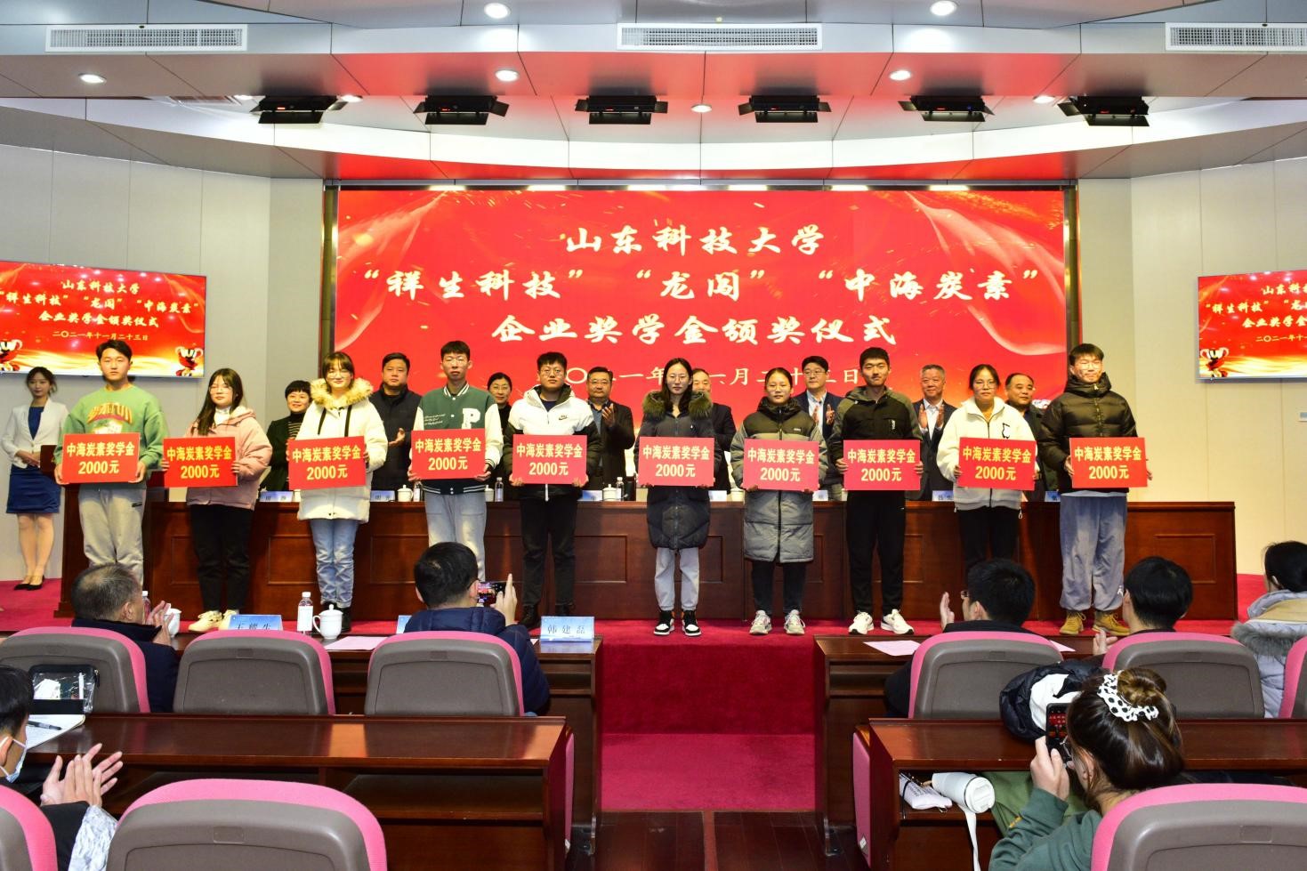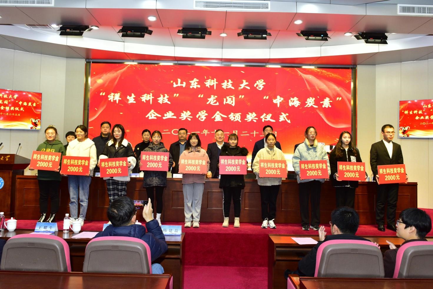 关于颁发2021年度“祥生科技”奖学金、“龙闯”奖学金、“中海炭素”奖学金的决定》,共60名学生获得奖学金,与会领导嘉宾为获奖学生颁发了奖学金。