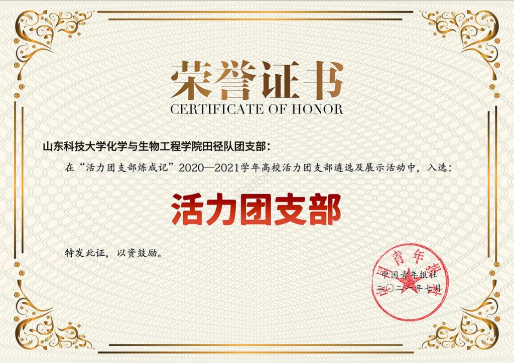 “活力”团支部等荣誉称号。支部多名团员获得学校、省政府和国家奖学金,获得学科竞赛获奖12项、创新创业竞赛获奖6项。在学院党委的关怀下,田径队贯彻“三会两制一课”制度,每月召开一次支部大会,每学期召开团员大会,每年度对团员进行教育评议,并多次举办特色活动,加强团队成员凝聚力。支部团员100%参与志愿服务,在寒暑假社会实践活动中,涌现出15名优秀志愿者、8名社会实践先进个人,志愿时数累计达1000余小时。超强的运动实力、辉煌的运动历史、对五四文化的学习传承,使田径队团支部形成了“团结向上、努力拼搏,坚韧不拔、敢为人先”的化工田径精神。