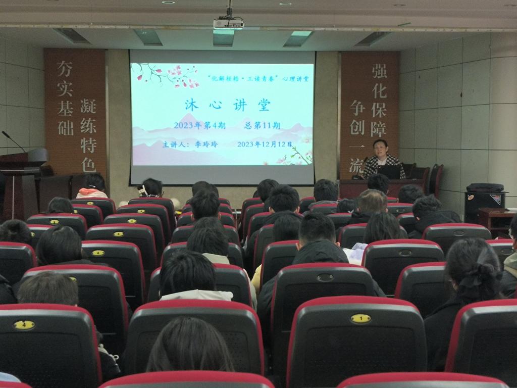 于12月12日下午在学院104报告厅举办2023年第4期(总第11期)“化解桎梏·工读青春”—沐心心理讲堂。此次讲座由学院心理健康教育负责老师李玲玲主讲,学院心健联全体成员以及宿舍心理观察员到场聆听。