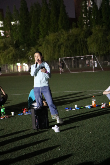 队员们席地而坐,在草坪上围成一个圈,把中心位置作为舞台。团支书王浩林在简短的致辞中谈到:2023-2024赛季已经结束,不管是冬季越野赛的双冠,还是校运会的五冠,所有的成绩是都是学院党委领导田径队当团支部所有队员共同努力的结果,现在起,我们要继续以昂扬的斗志和饱满的热情,同心同力,接续奋斗,在即将到来的2024-2025赛季,迎接新挑战,开启新征程。接着,他宣布欢歌会开始。音乐响起,大家争相演唱。优美的歌声,一首接着一首,在夜空中飘荡,遇到耳熟能详的歌曲更是此唱彼和。