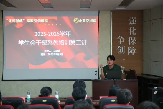 学生会干部系列培训会在J2-10学院报告厅拉开帷幕。此次培训面向全体学生会成员举办,由学院团委书记兼学工办主任易凡主持,特邀学院优选计划辅导员、2023级研究生庄世豪担任分享嘉宾。作为系列培训的第一讲,庄世豪做了充分的准备。他从自己在学生会担任干事到部长到副主席的成长路径谈起,结合兼任班级班长的本科生涯,侃侃而谈,分享了进入我校以来6年的学生干部经历,向大家讲述了一名优秀学生干部应具备的基本素质和各项能力。他指出,作为学生干部,要不忘初心,时刻谨记以“为同学服务”为宗旨;要主动担当,认真做到“件件有落实,事事有回音”。他的分享引发了老师同学的深刻共鸣。易凡在随后的点评中,高度评价了庄世豪在学生工作中的优异表现,号召学生会成员们以学长为标杆,多学习勤思考敢担当,在实际行动中为学院师生做好服务,协同推进各项工作再上新台阶。学生会执行主席纪超杰等同学纷纷表示,听了庄世豪学长的分享,更加明确了一个优秀的学生会干部的努力方向,会在今后的工作中,反思不足,主动担当,为师生多办实事多做好事,为学院建设贡献力量。